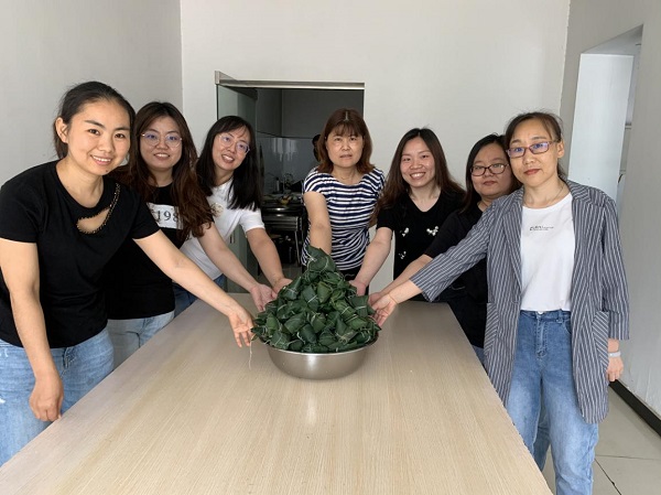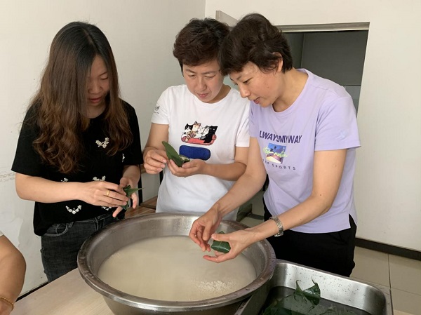 上午9點(diǎn),粽葉、糯米、大棗整齊地?cái)[上桌。大家邊包邊聊,其樂融融。在包粽子現(xiàn)場,熟悉包粽子的能手們飛快地拿起粽葉,兩手一窩卷成漏斗狀,填米、加棗、壓緊、扎繩,一氣呵成。她們還充當(dāng)起“老師”的角色,教“新手”職工包粽子,手把手現(xiàn)場教學(xué),“老師”教得仔細(xì),“學(xué)生”學(xué)得認(rèn)真,但要做出餡料十足、外觀漂亮的粽子還是需要費(fèi)一番功夫的。隨著技巧的不斷嫻熟,一個多小時的時間,形狀各異、大小不一的一百多個粽子就堆積成山了,預(yù)算科副科長竇夢娜說:“我們包粽子的水平真是越來越高了,明年再包會更好!”此時每個人心里都洋溢著一股喜悅之情,有初學(xué)一門手藝的欣喜,有參與集體活動交流感情的滿足。