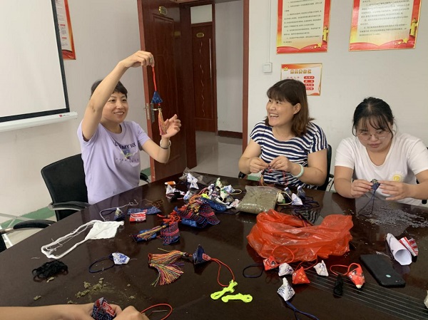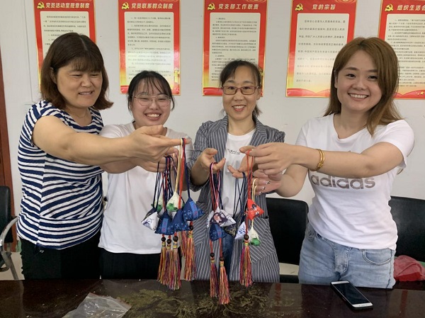 在傳統(tǒng)習(xí)俗中,玲瓏可愛的各色香包也是端午節(jié)必不可少的元素。包完粽子后大家轉(zhuǎn)移陣地到了活動室,大家圍坐桌邊,面前堆放著一份份材料包,有棉布、艾草、針線、中國結(jié)流蘇。面對這個從來沒有做過的DIY,大家開始研究起來,有的用手機(jī)搜索縫制方法流程,有的直接比來比去親自摸索著縫起來。有職工說:“這有點(diǎn)像咱們小時候老人們縫的毽子,那個里面裝的是五谷雜糧,咱們現(xiàn)在裝的是艾草?!薄斑@香囊可以掛在辦公室或者車上,有清香、驅(qū)蚊的功效。”“我算是知道了,這個流蘇應(yīng)該縫在這個邊的中間,而不是角上……”大家你一句我一句,手中的針線穿梭在棉布間,用密密的針腳縫制出傳統(tǒng)佳節(jié)最好的注解,用絲絲線線纏繞出端午安康的美滿寓意,一個個精巧可愛的三角香囊在大家的努力下完美呈現(xiàn)。