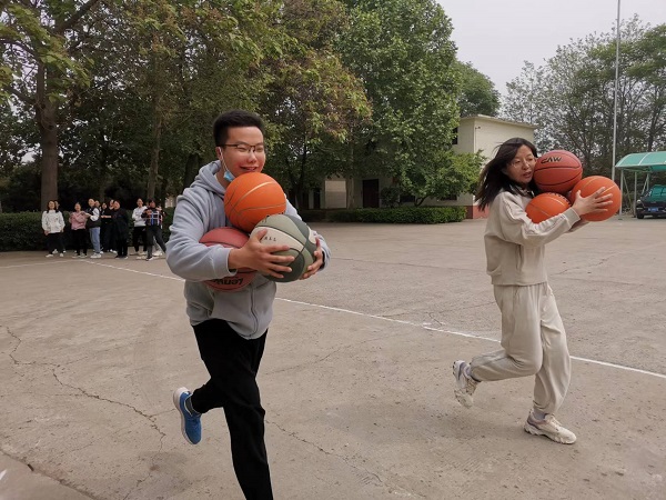 “誰先來?抱球游戲升級(jí)——1人抱4個(gè)籃球向前奔跑,過程中一個(gè)球也不得落地,否則成績無效。”裁判之一的審計(jì)科長談增迫不及待地宣布?!皞€(gè)子高的胳膊、腿長,有優(yōu)勢,先上?!比巳豪镉腥颂嶙h,工程科身高一米八的帥小伙劉文浩和綜合辦高個(gè)子王春影舉手示意,跑道上呈現(xiàn)二人灑脫、漂亮的抱球姿勢。