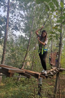 “叢林穿越”項(xiàng)目最受大家歡迎,有空中秋千、索道、走鋼絲、獨(dú)木橋、空中云梯、吊橋等一系列的拓展環(huán)節(jié)。叢林穿越過程中,劉暢作為今年新入職的職工,第一個(gè)走上了獨(dú)木橋的平臺(tái)上,只見她的雙手緊緊地抓住兩邊的繩子,目光堅(jiān)定,腳步穩(wěn)健,順利完成了第一個(gè)挑戰(zhàn)項(xiàng)目——獨(dú)木橋。隨后,來(lái)到走鋼絲的環(huán)節(jié),只見她小心翼翼試了試腳感,感覺比較安全,然后小碎步開始向前走。突然,鋼絲像秋千似的蕩起來(lái),于是她就改變了策略,邁開大步向前走,本來(lái)晃動(dòng)挺厲害的鋼絲慢慢靜止下來(lái),找到了最佳的方法后,還不忘向后面的同事傳授闖關(guān)秘籍,最后在她不懈的努力下闖關(guān)成功。就在大家紛紛踴躍嘗試拓展項(xiàng)目的過程中,發(fā)生了一個(gè)令人感動(dòng)的小插曲。機(jī)關(guān)后勤人員桂淑霞在闖空中云梯環(huán)節(jié)中,由于體力不支,突然她的雙腿從梯子的空隙中跌落下去,卡在梯子中,動(dòng)彈不得。正在后面闖關(guān)的財(cái)務(wù)科科長(zhǎng)宋敬凱看到了這一幕,他不顧自己的安危,飛快跑過去,幫桂淑霞把雙腿從空隙中“拔”了出來(lái),使她脫離險(xiǎn)境。