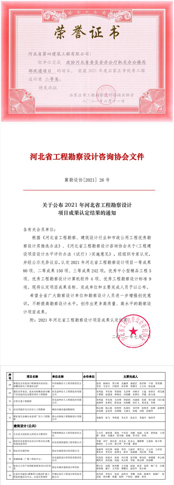 7月5日,公司河北四建收到榮譽(yù)證書和文件,《政協(xié)河北省委員會(huì)辦公廳機(jī)關(guān)辦公樓局部改造項(xiàng)目》獲2021年石家莊市優(yōu)秀工程設(shè)計(jì)獎(jiǎng)二等獎(jiǎng)、河北省工程勘察設(shè)計(jì)項(xiàng)目成果獎(jiǎng)三等獎(jiǎng)。