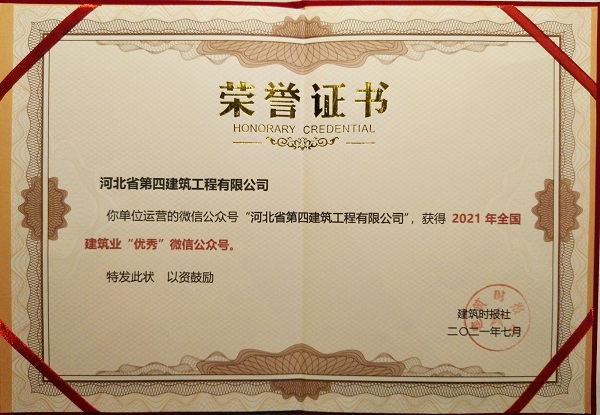 7月16日,在“2021建筑業(yè)微信公眾號(hào)運(yùn)維經(jīng)驗(yàn)交流研討會(huì)暨全國(guó)建筑業(yè)優(yōu)秀公眾號(hào)頒獎(jiǎng)典禮”上,公司微信公眾號(hào)“河北省河北四建有限公司”被評(píng)為“2021年全國(guó)建筑業(yè)優(yōu)秀微信公眾號(hào)”。