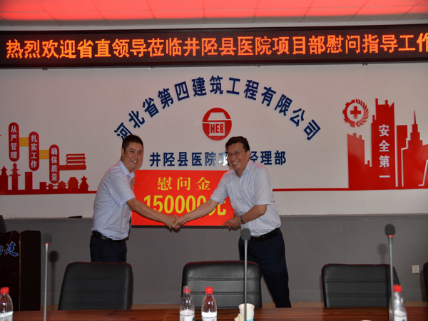 7月26日下午,河北省直工委副書記范金龍一行到二分公司井陘縣醫(yī)院項(xiàng)目部,對奮戰(zhàn)在一線的職工進(jìn)行暑期慰問,為他們送來了慰問金和慰問品。集團(tuán)工會(huì)主席王文利、公司黨委副書記、紀(jì)委書記、工會(huì)主席李懷生、二分公司黨總支書記孫立鋒一同參加。