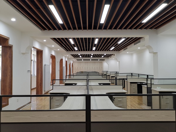 在該項目的裝飾設(shè)計中,河北四建充分利用原建筑條件,在盡可能節(jié)約裝修成本的基礎(chǔ)上,將辦公環(huán)境打造成為簡約優(yōu)雅、別具一格的空間。改造區(qū)域原為多個小型辦公室,并且處于院落的南面,采光極差。設(shè)計師經(jīng)過與領(lǐng)導(dǎo)協(xié)商,除保留個別房間外,將剩余的幾個辦公室隔墻拆除,從而獲得了一個大而開敞的辦公區(qū),可容納36個寬敞工位,并取消此辦公區(qū)域所有的門,且將原窗戶臺面降低至距地40厘米高,最大可能的利用了自然采光。色調(diào)的選擇上,墻面大面積采用白色乳膠漆與硅藻泥,一定程度上也彌補了自然采光的不足。