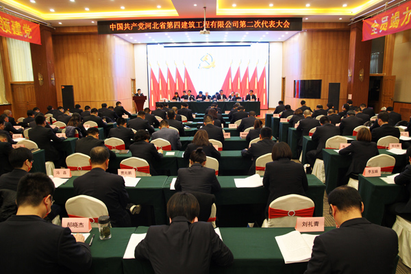 12月3日正午,石家莊市利淳商務(wù)酒店大型會議室。主席臺上金色的黨徽在十面紅旗的簇擁下顯得格外耀眼奪目,會場兩側(cè)懸掛著“黨建領(lǐng)航,優(yōu)質(zhì)高效大發(fā)展高歌猛進;全員竭力,做優(yōu)做強省四建前程似錦”的標語,既精辟概括了公司黨委過去五年領(lǐng)導(dǎo)發(fā)展的經(jīng)驗,更明確宣示了踏上新征程的堅守和依靠。會場后方正對著主席臺,五根朱紅色方柱上一條“解放思想、 大膽創(chuàng)新,凝神聚力、加快轉(zhuǎn)型,為再創(chuàng)河北四建新輝煌而努力奮斗!”長幅標語,向2000名職工吹響了奮進的號角。