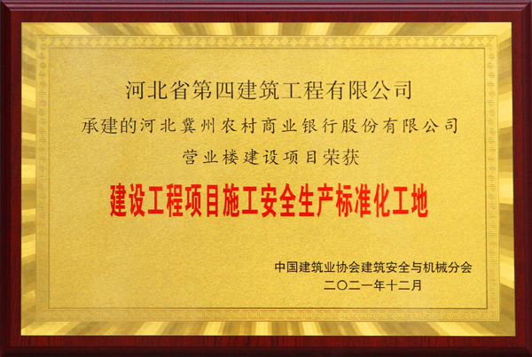 2021年12月22日,公司收到中國建筑業(yè)協(xié)會安全與機械分會下發(fā)的文件,我公司施工的河北冀州農(nóng)村商業(yè)銀行股份有限公司營業(yè)樓建設項目喜獲全國安全生產(chǎn)標準化工地,這是公司第9次獲得此項榮譽。