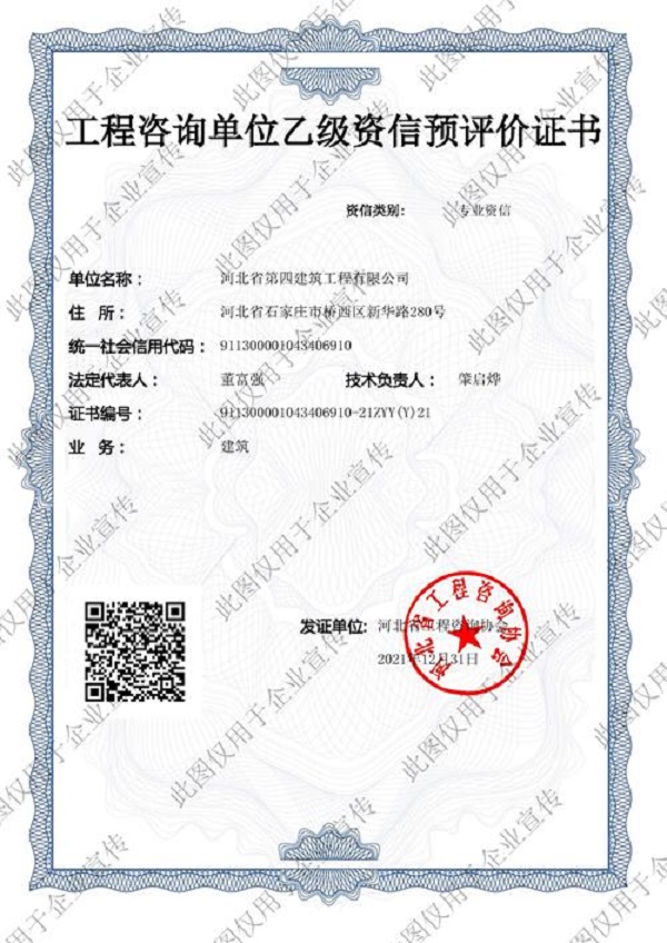 1月6日,河北四建喜獲“工程咨詢單位(建筑)乙級(jí)資信預(yù)評(píng)價(jià)證書”。河北四建將可在本專業(yè)內(nèi)承攬建設(shè)項(xiàng)目的工程咨詢業(yè)務(wù),新業(yè)務(wù)的注入為河北四建帶來(lái)新的活力,標(biāo)志著河北四建在工程咨詢服務(wù)領(lǐng)域迎來(lái)廣闊的發(fā)展空間。