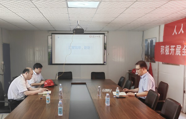在項目會議室,董富強首先聽取了項目部關(guān)于進度、安全、質(zhì)量、文明施工等情況的匯報。他邊聽邊記,邊聽邊問,“施工進度怎么保證?”“創(chuàng)優(yōu)目標如何實現(xiàn)?”……他問得很細,記得認真,反復強調(diào)施工任務要再細化,務必卡緊節(jié)點,創(chuàng)優(yōu)工作要再深入,務必措施到位。在項目施工現(xiàn)場,董富強實地了解工程進展情況并進行指導。正值全國“安全生產(chǎn)月”活動開展之際,董富強要求項目部提高政治站位,壓緊壓實責任,落細落實管控措施,確保施工安全。