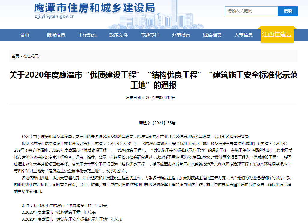 4月12日,從江西省鷹潭市住房和城鄉(xiāng)建設(shè)局網(wǎng)站獲悉,四分公司承建的鷹潭市檔案中心項目喜獲2020年度鷹潭市結(jié)構(gòu)優(yōu)良工程和建筑施工安全標(biāo)準(zhǔn)化示范工地兩項榮譽。