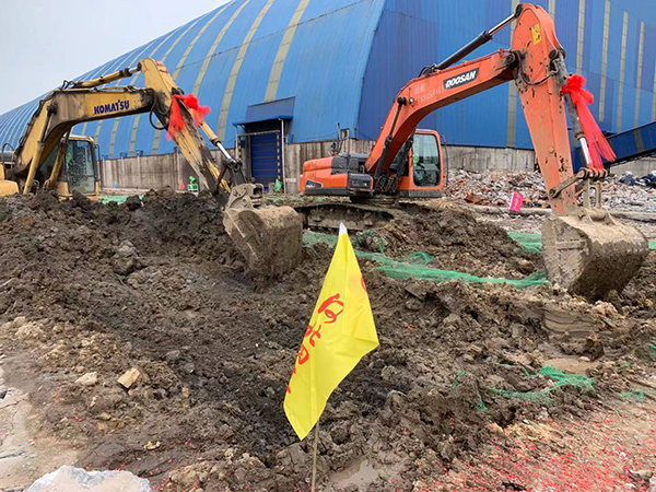 5月2日和3日連續(xù)降雨,打樁后產生的淤泥經大雨沖刷散布現(xiàn)場各處,雨后項目全體人員開始清淤工作,因環(huán)保要求白天不宜外運出場,管理人員便夜間加班“作戰(zhàn)”,爭分奪秒為后續(xù)工作創(chuàng)造工作面。白天平整場地、夜間倒運淤泥,經過項目全體人員的連日奮戰(zhàn),使項目具備了開工條件。