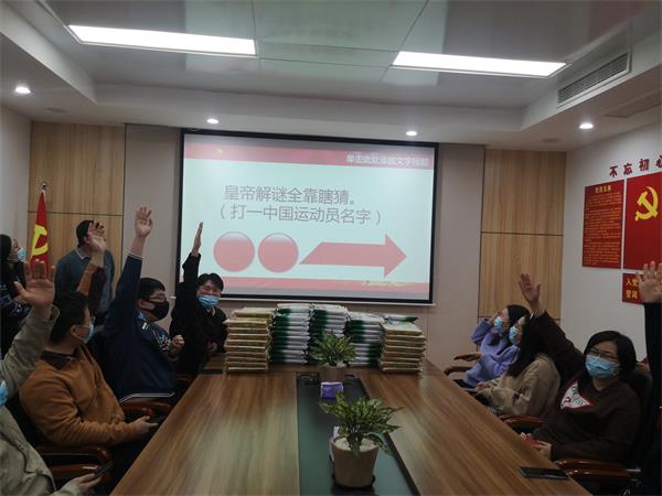 “正月十五貼對(duì)聯(lián),打一北京冬奧比賽場(chǎng)地。”大屏幕剛一翻開(kāi),職工們紛紛參與競(jìng)答,司南第一個(gè)站起來(lái)說(shuō):“是崇禮”,梁靖昆馬上跟上說(shuō):“你說(shuō)的不對(duì),應(yīng)該是延慶”,組織者說(shuō):“梁靖昆答對(duì)了,發(fā)獎(jiǎng)品”?!罢f(shuō)上兩句趕緊溜,打一冬奧比賽項(xiàng)目?!敝灰?jiàn)李天昊站起來(lái)說(shuō):“是短道速滑,2月7日,任子威獲得了北京冬奧會(huì)短道速滑男子1000米冠軍,實(shí)現(xiàn)了中國(guó)隊(duì)在該項(xiàng)目上冬奧金牌零的突破??次疫@大長(zhǎng)腿,也非常適合這個(gè)項(xiàng)目?!贝蠹液迦淮笮??!按饘?duì)了,發(fā)獎(jiǎng)品?!彪S著獎(jiǎng)品的不斷發(fā)放,大家的熱情更高了,展開(kāi)了更加激烈的角逐,活動(dòng)現(xiàn)場(chǎng)精彩紛呈、高潮迭起,充滿了活力和趣味?;顒?dòng)結(jié)束后,組織人員還為每名職工發(fā)放了湯圓。