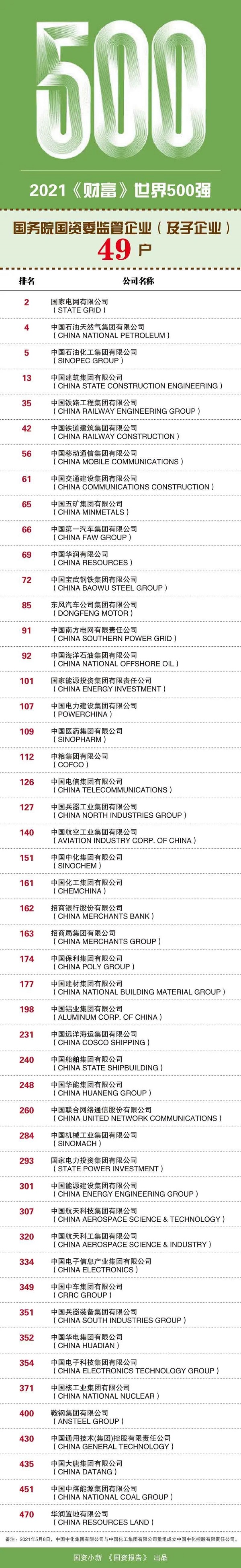 2021年度國務(wù)院國資委監(jiān)管的49家入圍世界500強(qiáng)的中央企業(yè)(及子企業(yè))完整名單