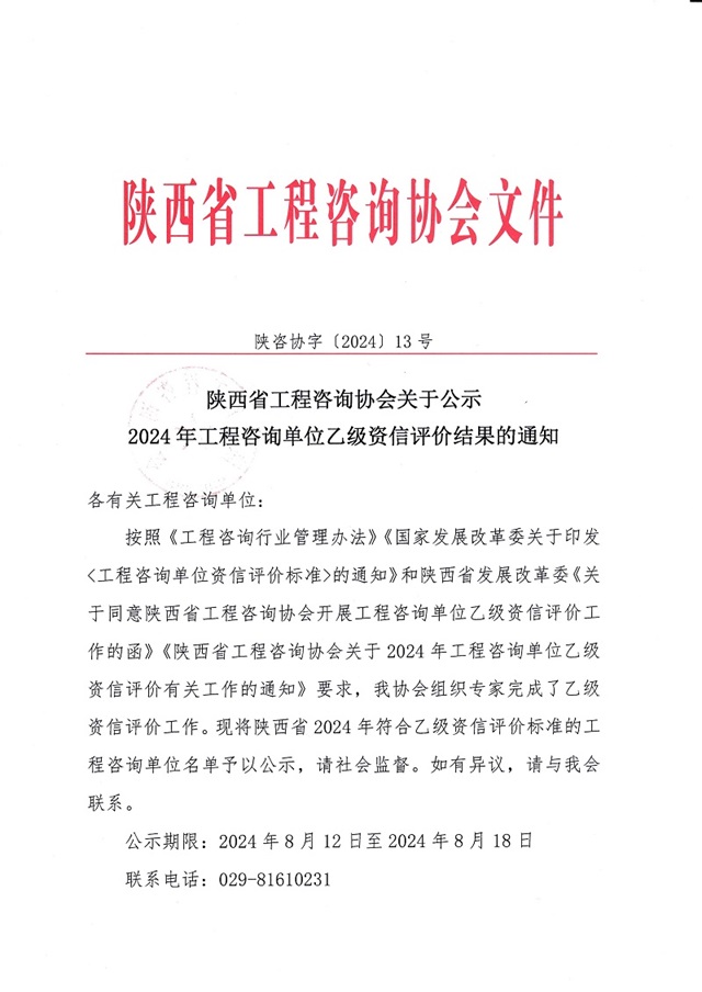 近日,陜西省工程咨詢協(xié)會發(fā)布《關于公示2024年工程咨詢單位乙級資信評價結果的通知》,我公司通過了陜西省2024年工程咨詢單位乙級資信評價。